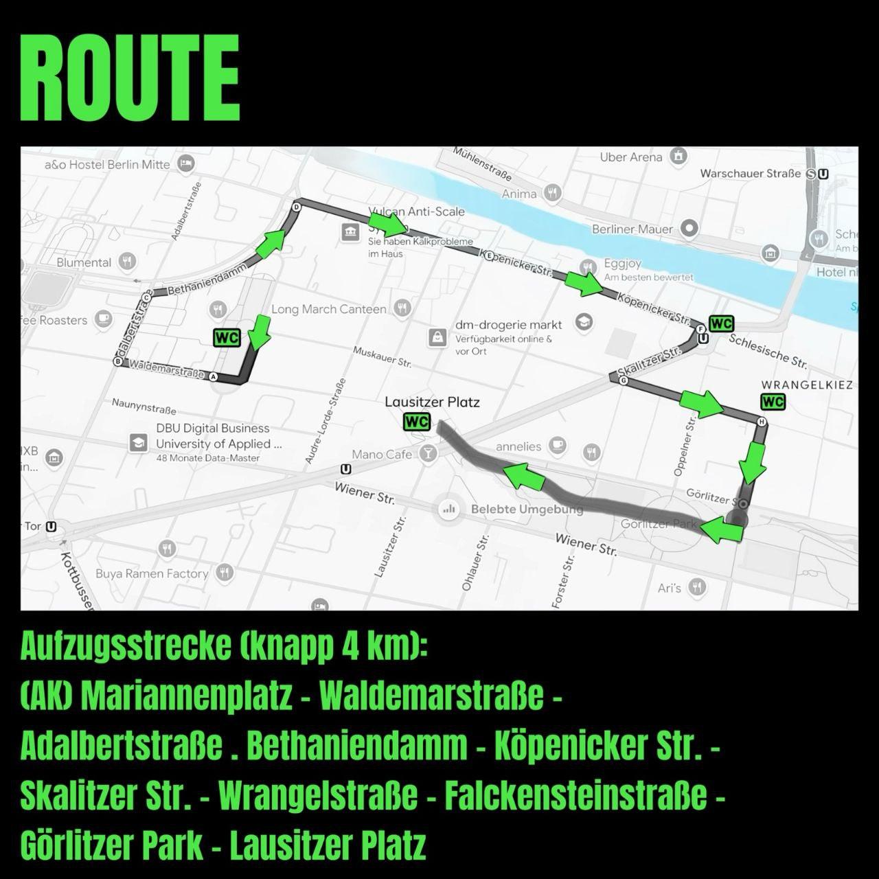 (AK) Mariannenplatz – Waldemarstraße – Adalbertstraße – Bethaniendamm – Köpenicker Str. – Skalitzer Str. – Wrangelstraße – Falckensteinstraße – Görlitzer Park – Lausitzer Platz